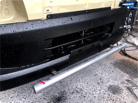 両端は車体側に斜めに溶接し、バンパーのラインに合わせます。